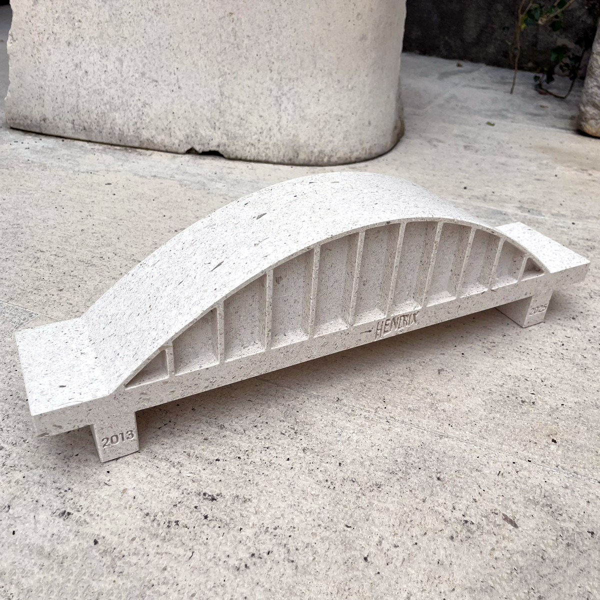 S obzirom na to da je originalna konstrukcija mosta izvedena u metalu i velikih dimenzija, bilo je potrebno prilagoditi dizajn kako bi skulptura u kamenu zadržala prepoznatljivost, ali i funkcionalnost u manjem formatu. Upravo u tom procesu oblikovanja posebno dolazi do izražaja naša radionica, gdje ideja prelazi u konkretan oblik kroz pažljivo klesanje i obradu kamena. Umjesto doslovne replike, odlučili smo se za stilizirani pristup – most smo sveli na njegove osnovne linije i konture, naglašavajući njegovu siluetu i ritam konstrukcije. Time je skulptura dobila suvremeniji, gotovo minimalistički karakter, dok je istovremeno zadržala svoju simboliku.