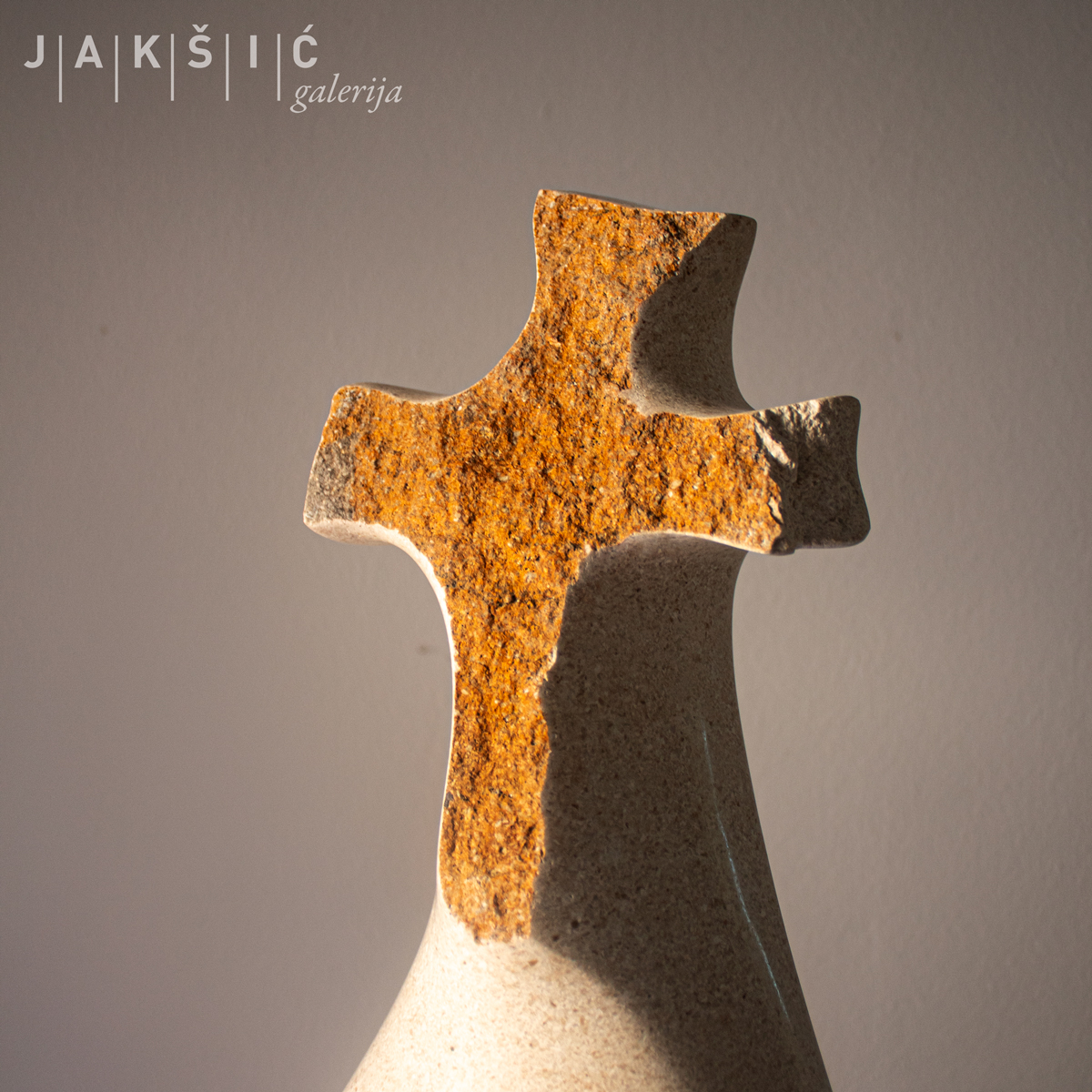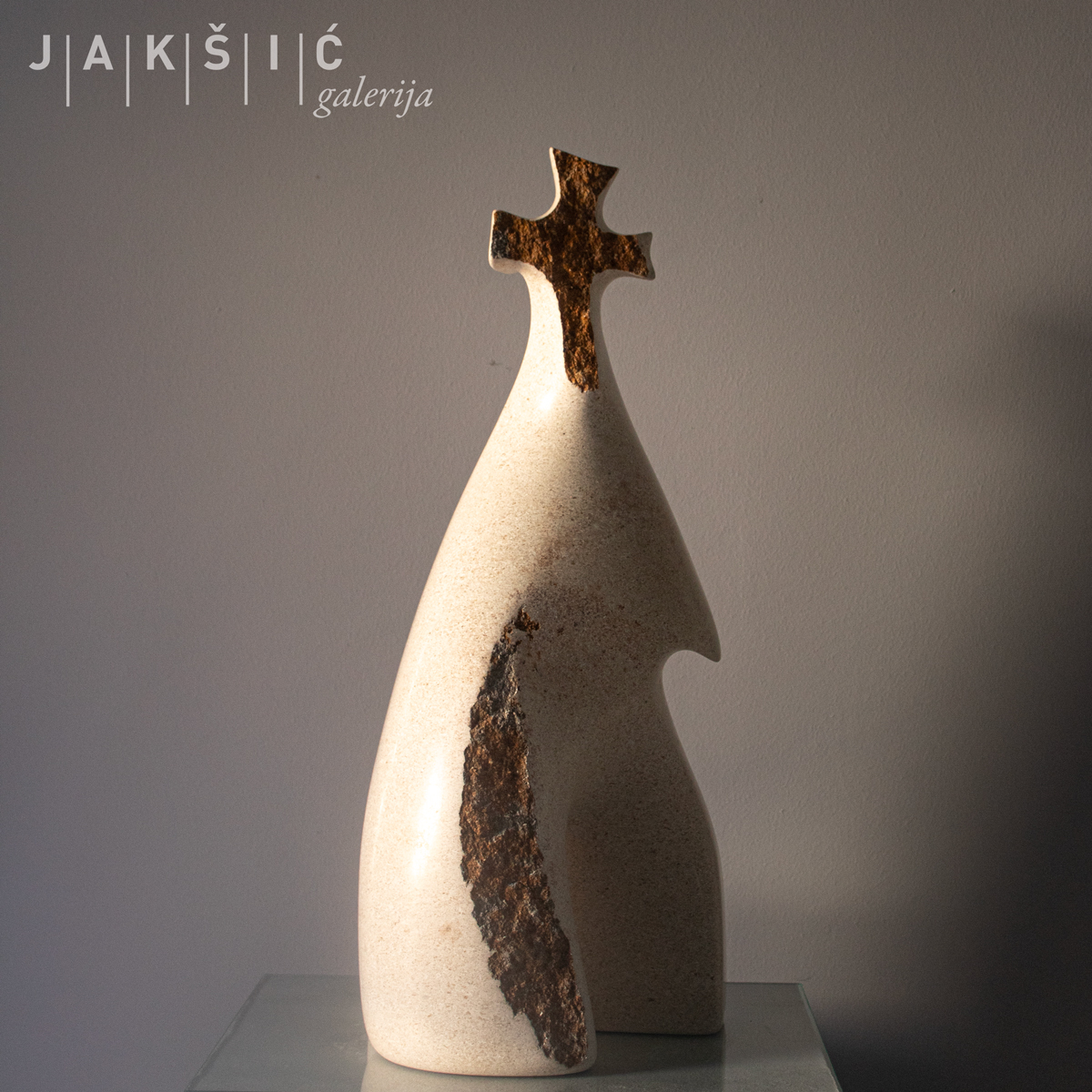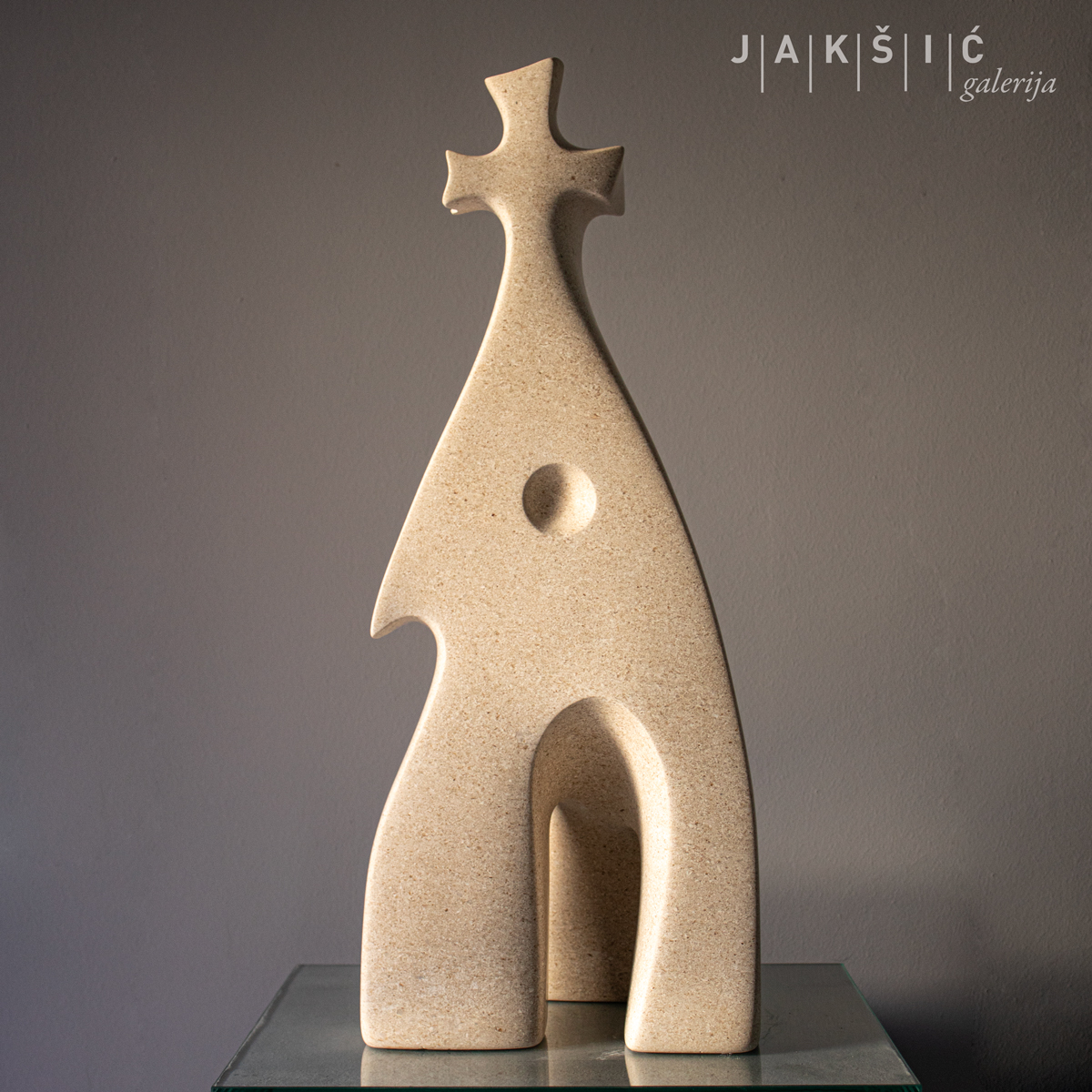 U Jakšić galeriji predstavljamo novu skulpturu našeg akademskog kipara Lovre Jakšić. Riječ je o djelu koje se jasno pozicionira kao skulptura katedrale, ali i kao snažna moderna skulptura na temu sakralne umjetnosti. Skulptura je izrađena od bijelog bračkog kamena u našoj radionici, a izložena je u Jakšić galeriji u Splitu.