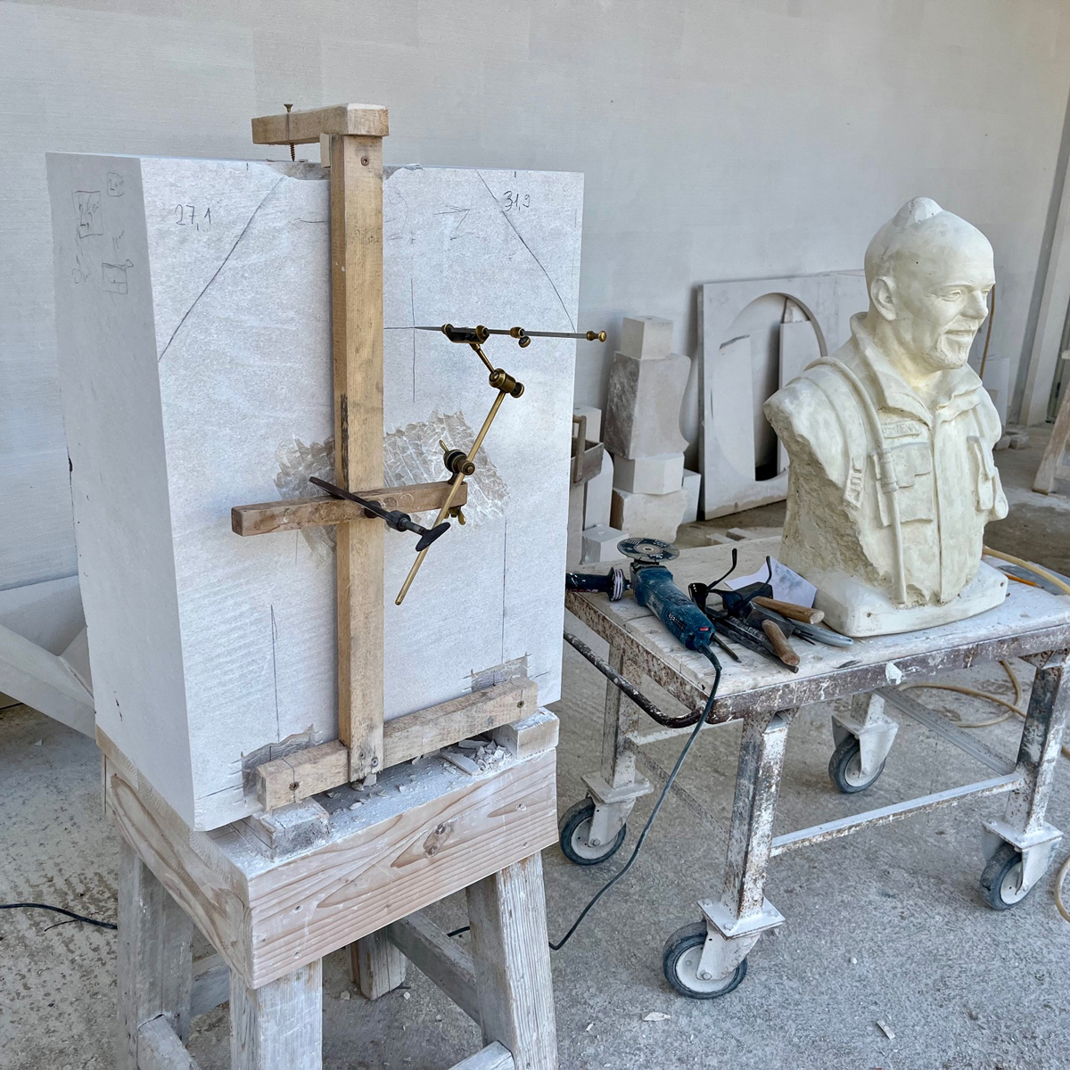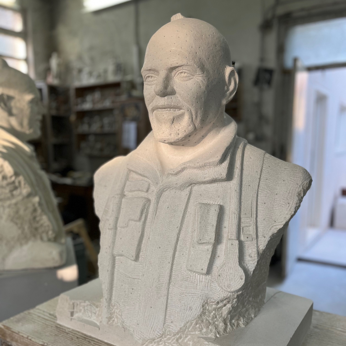 Proces modeliranja i izrade gipsanih odljevaka odvija se u ateljeu našeg kipara, gdje se oblikuje konačni izraz portreta. Sama izrada portreta u kamenu realizira se u našoj radionici u Donjem Humcu na otoku Braču. Upravo ondje, u prostoru s dugom klesarskom tradicijom, započinje zahtjevna faza punktiranja. Punktiranje je klasična kiparska tehnika kojom se mjere s gipsanog modela precizno prenose u kamen. Svaki detalj mora biti točan. Svaki zahvat promišljen.